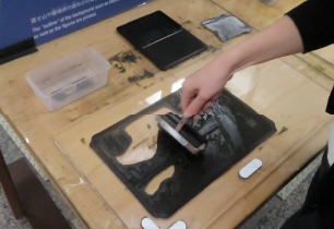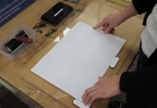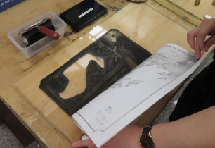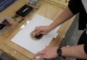 バレンをつかって紙を摺ります。紙がずれない様に片手で押さえてください。