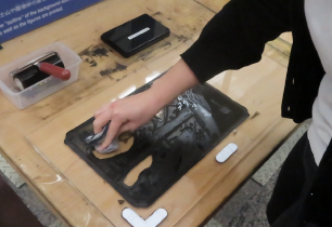 濡れ布巾ではみ出したインクを拭き取ります。版の凹部分の汚れも拭き取ります。