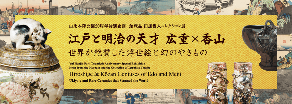 この節目の年を記念し、当館所蔵品を代表する『木曾海道六拾九次之内(きそかいどうろくじゅうきゅうつぎのうち)』、『東海道五拾三次之内(とうかいどうごじゅうさんつぎのうち)』(保永堂版東海道)と共に、田邊哲人コレクションより眞葛焼(まくずやき)の数々を一挙公開いたします。海外の芸術家や収集家に愛された浮世絵版画と、輸出品として海を渡り「幻のやきもの」として近年注目を浴びる眞葛焼。世界が絶賛した名品の競演に、ぜひご期待ください。