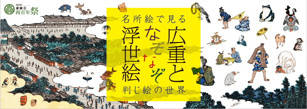 目で見るなぞなぞ「判じ絵」。答えとは直接無関係の絵や文字から隠された意味を導き出す、遊び心が詰まった浮世絵です。本展覧会では、名所や食べ物、道具といった様々なテーマを扱った判じ絵を展示いたします。名所を題材とした判じ絵では、その場所を描いた広重の名所絵を答えとしてご紹介し、判じ絵と名所絵を同時にお楽しみいただける当館ならではの展示といたしました。判じ絵が示した場所を広重の作品ではどのような風景だったのかお確かめください。