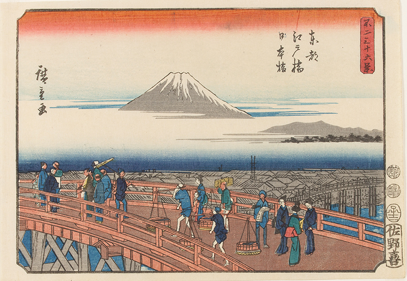 不二三十六景は広重が描いた最初の富士三十六景シリーズで、嘉永五年(1852)頃に版元佐野屋喜兵衛から刊行されました。大きさは横中判で『冨士三十六景』のちょうど半分です。広重の横絵作品には珍しく「東都両國橋下」や「駿河田子の浦」において「近像型構図」が用いられ、晩年の画風変遷を辿る上で重要な作品です。