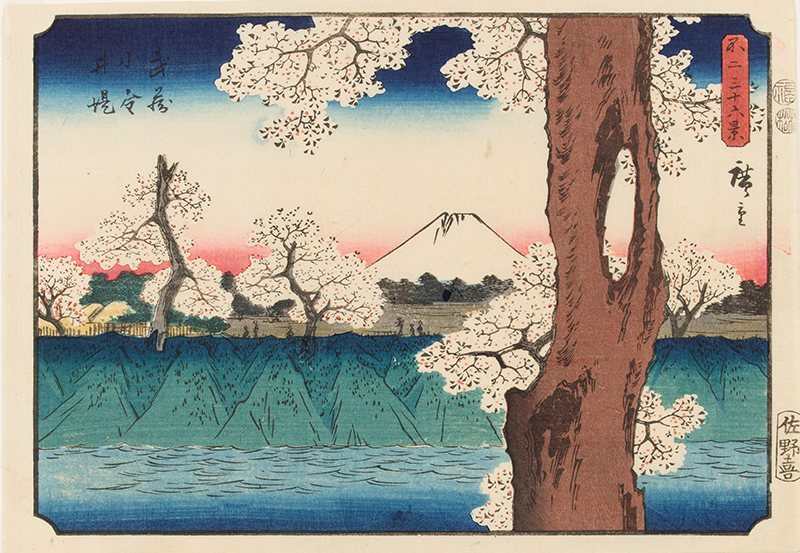 冨士三十六景は竪大判の錦絵で、広重が没する安政五年(1858)に版下絵が制作され、翌年に版元蔦屋吉蔵から出版されました。竪長の画面を生かすために俯瞰図法を用い奥行を広く取って遠近感を出したり、近景のモチーフを拡大して描く「近像型構図」を用いた画面構成が斬新な作品です。