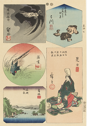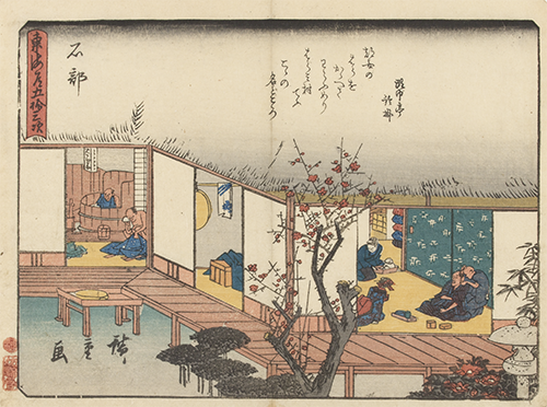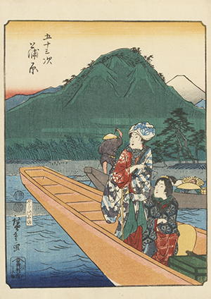 本展では当館が所蔵する広重が手掛けた東海道シリーズ10種の内、Part1では人物が主体の『五十三次』(人物東海道)、Part2では狂歌が画中に詠みこまれた『東海道五拾三次』(狂歌入東海道)を大展示室にて全宿場の作品をそれぞれの会期で一挙公開。さらに小展示室では『東海道五十三次細見圖會』(Part1展示)、『東海道張交圖會』(Part2展示)といった変わり種の東海道五十三次のシリーズを紹介します。