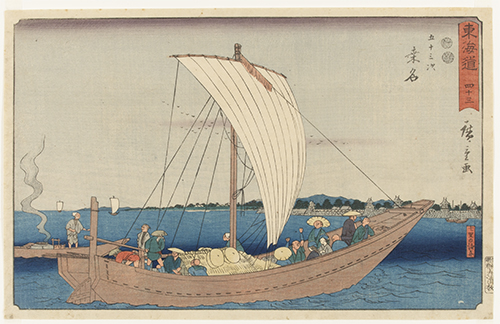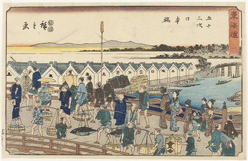 関ヶ原の戦いの勝利により、権力を強めた徳川家康がそれを盤石なものとすべく手掛けたのが、自身の居城である江戸から京坂を結ぶ「東海道」の整備でした。家康によって各宿場が制定され、整備が進んでいった街道には多くの人やものが行き交うようになり、江戸時代後半には庶民の旅ブームが起こりました。このブームを背景に生まれたのが歌川広重の『東海道五拾三次之内』(保永堂版)をはじめとする「東海道五十三次」の浮世絵シリーズ作品です。