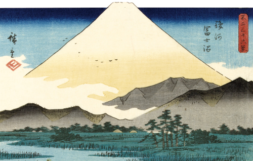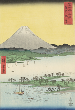 北斎よりも37歳年下となる歌川広重は、50代半ばとなり名所絵師の名を不動のものにしていた嘉永四~五年(1851~1852)頃に中判横の『不二三十六景』(全36図)、また没年である安政五年(1858)に制作し、翌六年に目録をつけて刊行された大判竪の『冨士三十六景』(目録含め全37図)という二つの揃物作品を手掛けています。