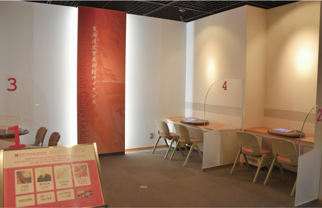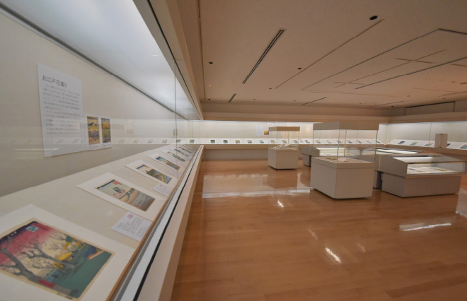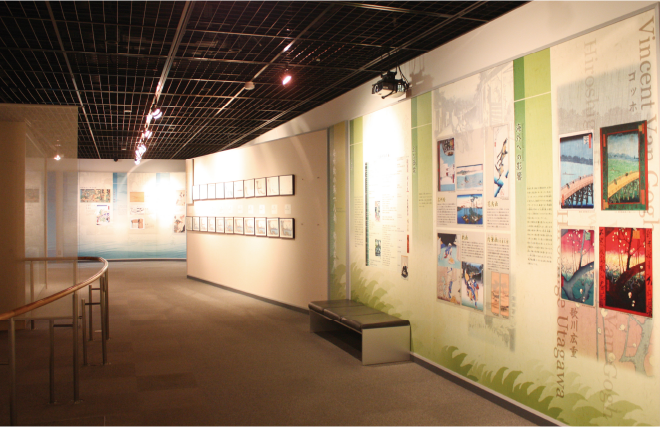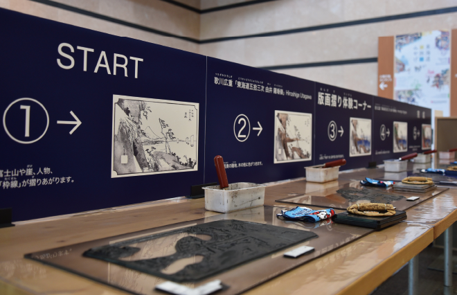 館内には大展示室、小展示室の他、浮世絵の基礎知識、ガイダンスルームをご用意しています。エントランスホールには、浮世絵版画多色摺りの「版画摺り体験コーナー」があり、“広重”や“東海道”をキーワードに、江戸文化への理解を深めて頂けます。
